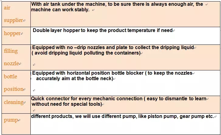Ova mašina posebno je napravljena za sve vrste viskoznosti / tečnosti u prehrambenoj industriji, hemijskoj industriji i sirovinama, kao što su motorno ulje, motorno ulje, salata, gel za pranje ruku, kokosovo ulje, sojin sos, sezam, šampon, tečni sapun, motorno ulje , kočiono ulje, ulje za kuhanje, sos od rajčice, napitak, esencijalno ulje, biljno ulje, med, sos od bibera, kikiriki puter, jogurt, sok, napitak itd. Svi kontaktirani dio s tekućinom / umakom je visokokvalitetni nehrđajući čelik. Mašina prihvaća klipnu pumpu za punjenje. Podešavanjem pozicijske pumpe može se puniti sve boce u jednoj mašini za punjenje, velikom brzinom i velikom preciznošću.